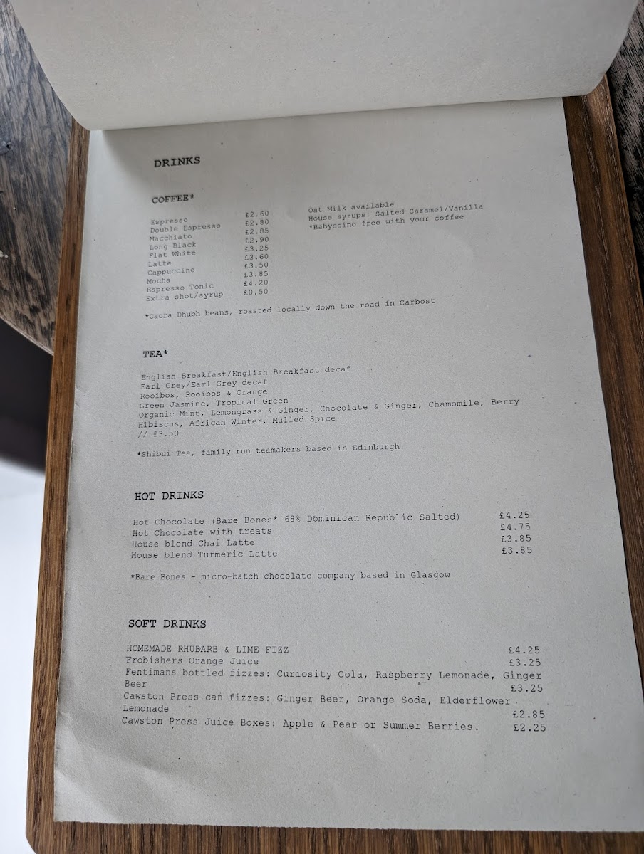 Visitors can enjoy a variety of comforting options—from freshly baked cakes, muffins, and scones to hearty breakfast plates like the veggie breakfast or English breakfast. Light lunches might include warming soups, sandwiches such as treacle cured ham, or savory muffins made with local ingredients. For those seeking a sweet pause, choices like carrot cake, cheesecake, and rocky road brownies are delightful companions to a hot chai or a rich cappuccino.